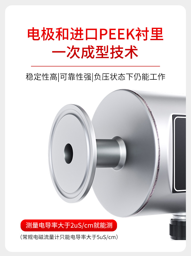 LDG-MIK卡箍式电磁流量计根据法拉第电磁感应定律进行流量测量。电磁流量计的优点是压损极小,可测流量范围大。最大流量与最小流量的比值一般为20:1以上,适用的工业管径范围宽,输出信号和被测流量呈线性,精确度较高,可测量电导率≥5μs/cm的液体。 电磁流量计卡箍式安装方式具有安装、清洗方便等优点,常应用于食品生产、制药行业药剂测量以及净水监测等场合。