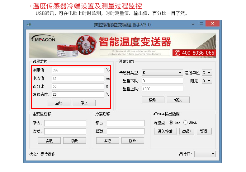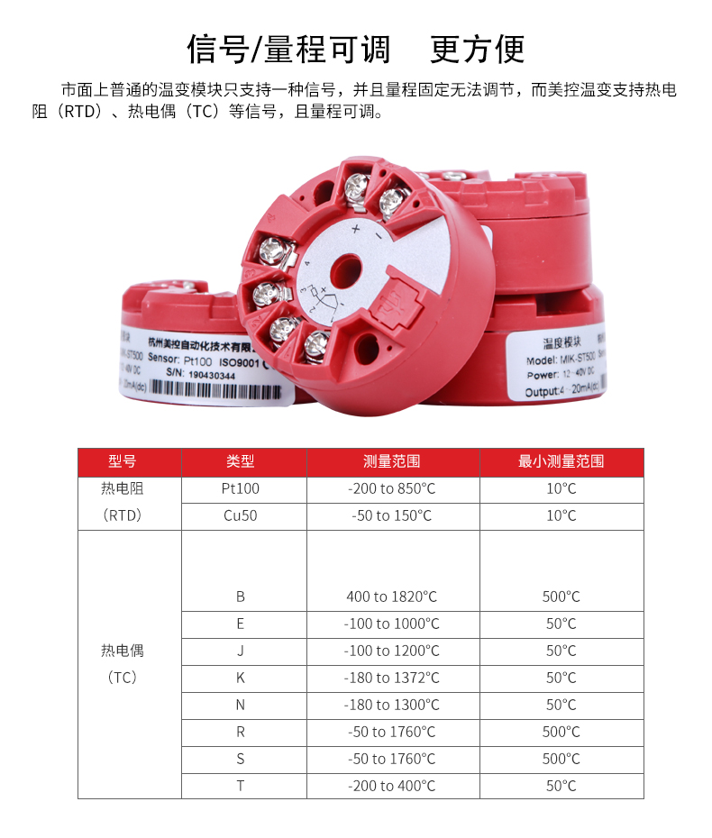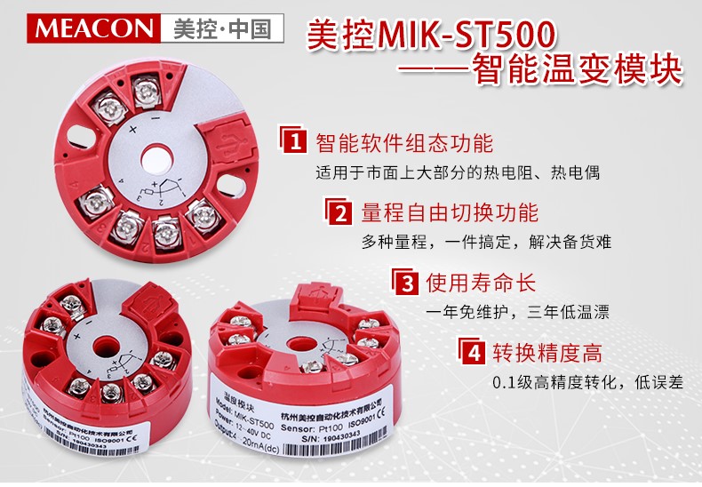 MIK-ST500作为新一代的温度变送枢纽,他的兼容性和精度远远领先同类温湿度变送器,通过V6编程线连接电脑USB端口,可由电脑监控数据并调整对接的传感器类型和量程上下限,其所提供的全面单点测量解决方案,包括了PT100,CU50及各类热电偶。顶部安装式智能温度变送器,用于热电阻(RTD)、热电偶(TC)、电阻(Ω)、电压(mv)信号输入,将各种输入信号转换为4-20MA输出信号。