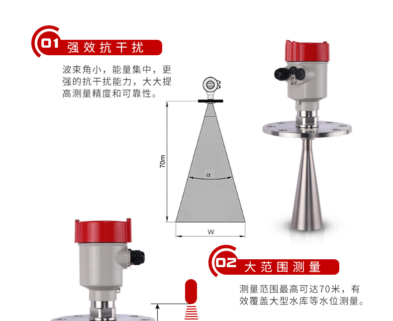 l 波束角小,能量集中,具有更强抗干扰能力,大大提高了测量精度和可靠性