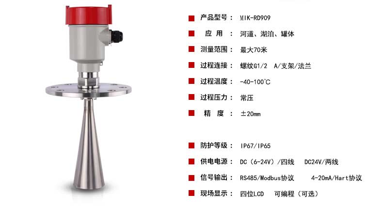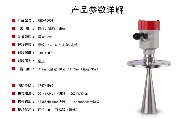 本产品波束能量低,对人体及环境均无伤害,还具有不受介质比重的影响、不受介电常数变化的影响、不需要现场校调等优点,广泛应用江河、水库、湖泊、灌渠、河道等自然水域水文监测场合。